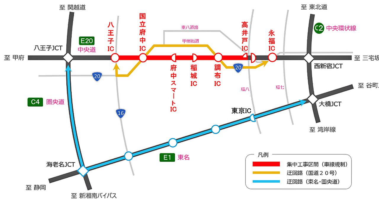 Nexco中日本 中央道 高井戸ic 八王子icで集中工事 5月11日 29日の平日18時 翌6時 東名や国道20号への迂回を トラベル Watch